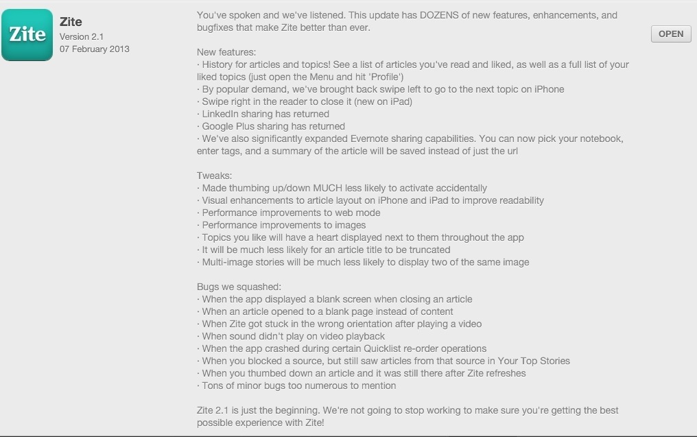Zite just got updated – what have they done! February 7, 2013Apple, Tech NewsGavin Fabiani-Laymond Zite just got a big update with IMO a horrid green icon. List of new stuff and bug fixes as below. What do you think of that icon? Share this: Share on X (Opens in new window) X Share on Facebook (Opens in new window) Facebook Email a link to a friend (Opens in new window) Email Share on Telegram (Opens in new window) Telegram Share on WhatsApp (Opens in new window) WhatsApp Share on Pinterest (Opens in new window) Pinterest Share on LinkedIn (Opens in new window) LinkedIn Share on Reddit (Opens in new window) Reddit Like Loading... Related