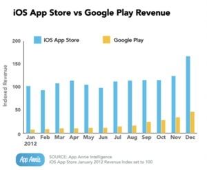 App Annie released inJanuary 2013 itsindex covering revenue from mobile app sales in the App Store and on Google Play. While Apple was able to hit record revenues in December, increasing revenue by one-third during the month and growing by one-fifth from Q3 to Q4, Android posted even stronger growth doubling revenue quarter-over-quarter.