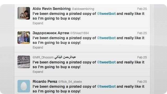 Tweetbot naming and shaming pirates February 27, 2013UncategorizedGavin Fabiani-Laymond In a rather slick move Tweetbot is fighting back over people who pirate their great software by adding tweets into their timeline as shown below telling the world exactly what they are doing. Clever idea IMO. Share this: Share on X (Opens in new window) X Share on Facebook (Opens in new window) Facebook Email a link to a friend (Opens in new window) Email Share on Telegram (Opens in new window) Telegram Share on WhatsApp (Opens in new window) WhatsApp Share on Pinterest (Opens in new window) Pinterest Share on LinkedIn (Opens in new window) LinkedIn Share on Reddit (Opens in new window) Reddit Like Loading... Related