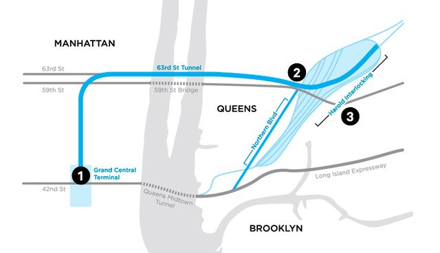 The above diagram displays the East Side Access project, New York’s newest railroad will connect the Long Island Railroad to Grand Central Terminal. And the tunnel beneath the East River, which will connect the entire system, was started back in 1969.