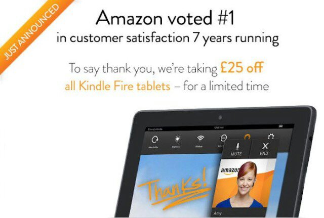 Amazon U.K. has slashed £25 off all Kindle Fire tablets for a limited time to say thank you to customers who voted the retail giant number one in customer satisfaction for the seventh year running. The offers ends on Monday, January 20, at 11:59 p.m. GMT. The discount is valid for one device per customer, and can be applied against all versions of the Kindle Fire — including the Kindle Fire HD, Kindle Fire HD 8.9″, Kindle Fire HDX, and Kindle Fire HDX 8.9″. Simply order the device from Amazon.co.uk, then use the code “MAYDAY25” at checkout.