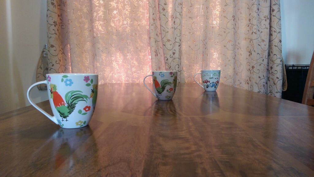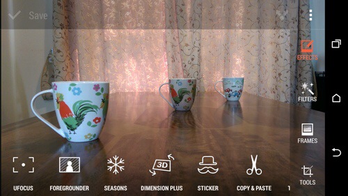 Another one of the effect that uses the data from the second lens is Dimension Plus. From here you rotate or swivel the phone to adjust how the items move around in the photo. You can then save what you see as a fixed photo or a Dimension Plus photo so you can keep playing around moving the mugs into different angles. Below is fixed photo.