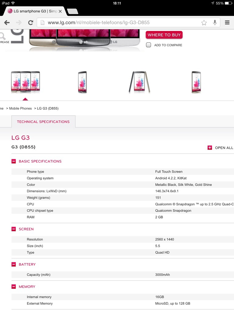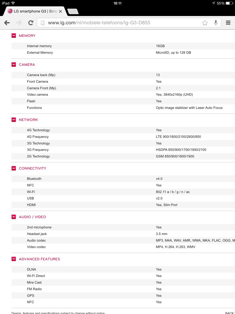 The Official LG G3 specifications from LG May 26, 2014Android, Tech Newslg g3 official specs by lgGavin Fabiani-Laymond Why wait until tomorrow. Below are the screen shots from LG Netherlands showing the specifications in full. It looks like it’s a only 16gb internal storage instead of 32gb which is a shame. Share this: Share on X (Opens in new window) X Share on Facebook (Opens in new window) Facebook Email a link to a friend (Opens in new window) Email Share on Telegram (Opens in new window) Telegram Share on WhatsApp (Opens in new window) WhatsApp Share on Pinterest (Opens in new window) Pinterest Share on LinkedIn (Opens in new window) LinkedIn Share on Reddit (Opens in new window) Reddit Like Loading... Related