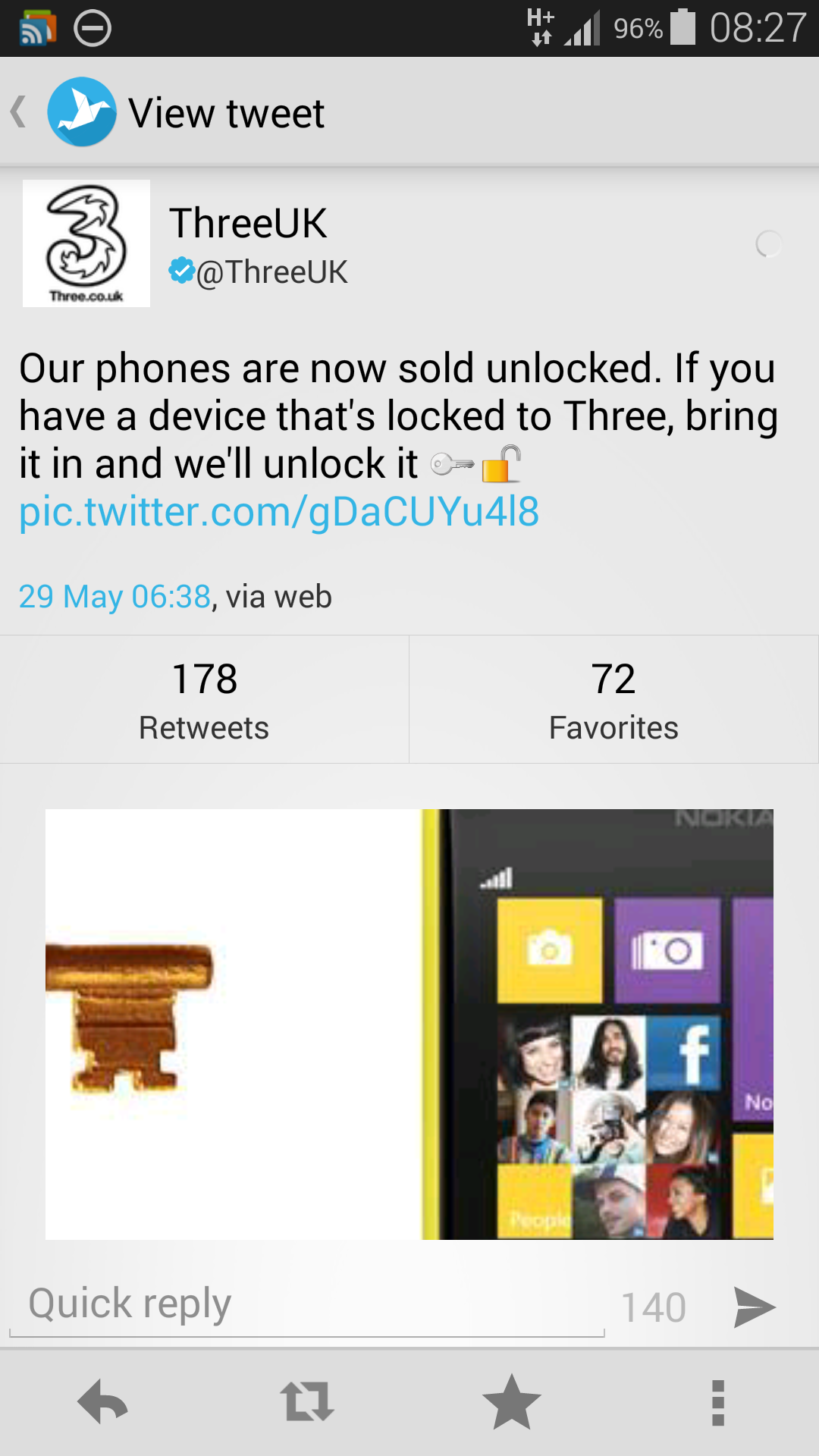 Three UK sets the standard May 31, 2014Tech Newsthree UK selling unlocked phonesGavin Fabiani-Laymond Three UK tweeted that all of their phones are now sold unlocked. Even better they will unlock any 3 phones you have that are locked. Now let’s see if the other networks follow suit. Share this: Click to share on X (Opens in new window) X Click to share on Facebook (Opens in new window) Facebook Click to email a link to a friend (Opens in new window) Email Click to share on Telegram (Opens in new window) Telegram Click to share on WhatsApp (Opens in new window) WhatsApp Click to share on Pinterest (Opens in new window) Pinterest Click to share on LinkedIn (Opens in new window) LinkedIn Click to share on Reddit (Opens in new window) Reddit Like Loading... Related