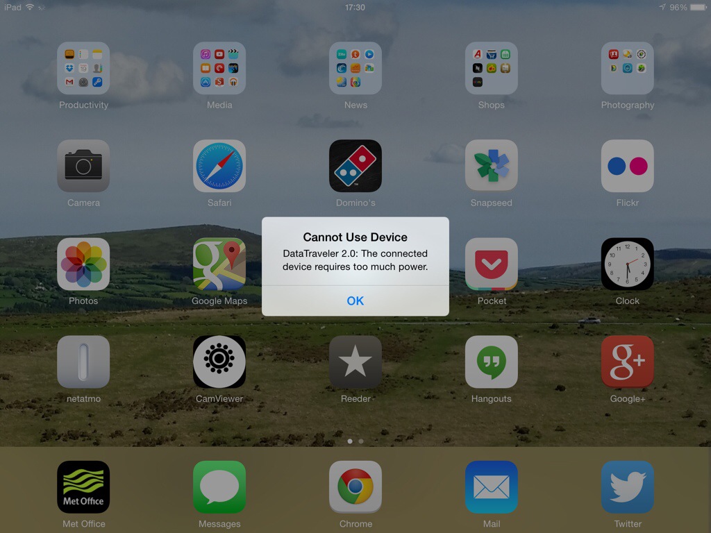 I have an android phone, a Samsung Galaxy K Zoom. Now if I had any other device apart from an Apple device I could send the photos by Bluetooth or wifi direct. But oh no, Apple has to have a closed system. No problem I thought. Buy the USB to lightning port camera adapter for the iPad, shown above in white. Buy a USB storage stick. So using the micro OTG adapter I plugged the memory stick into my K Zoom and copied the photos across. Then, I placed the memory stick into the lightning adapter and plugged it into my iPad. And xxxx xxxx xxxxx piece of crapware produces the message as shown in the first photo. Not enough power. Well my phone that costs over 50% less had no issue. Now before anyone says, use the cloud. There is no way I’m waiting for 500 photos to get uploaded to a cloud service , for me to have to them re download them on to another device. It takes minutes using a USB stick.