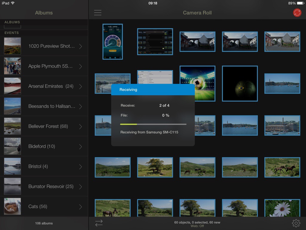 So what the above screen shots show is the process of moving 4 photos I selected from my android phone to my iPad. The order is slightly wrong, but I’m sure you can fathom out the correct order of the screen shots 😉 But you could move the photos, or receive, between any combination. What is also clever is that you can send the photos from say my Samsung Galaxy K Zoom to my mac. The photos can either go to a folder chosen by yourself, or end up directly in iPhoto or Aperture. Neat touch. And because it’s using wifi you can be downstairs and send the photos to your mac which can be located in another room.