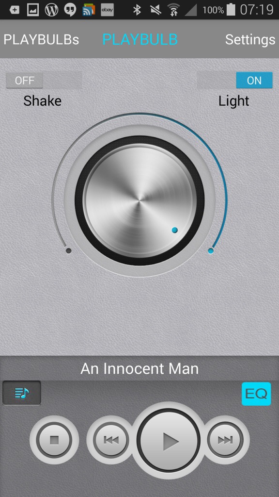 On this page you can use the slider to adjust the light strength, you shake to turn on or off, access music on the phone and tap in the settings.