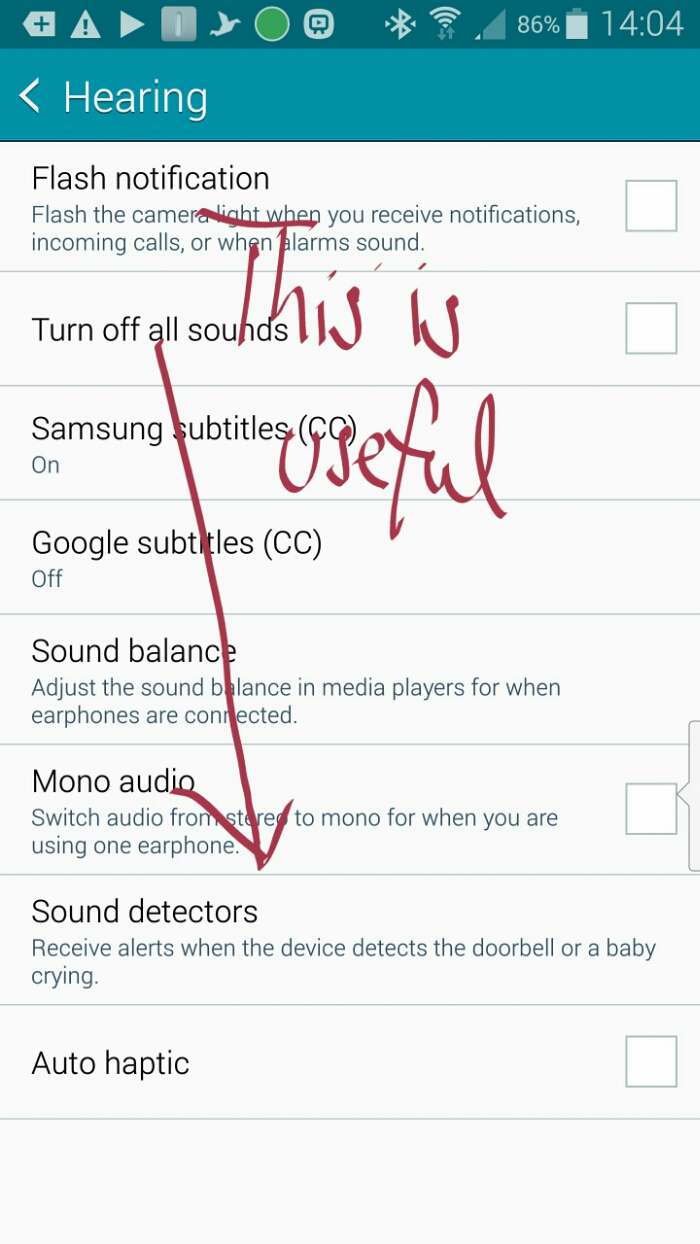 First up is the option in accessibility to be notified of a doorbell or crying baby. Works well when listening to music. You can select to have either a baby crying or doorbell notified or both. Note S Voice and OK Google voice activation has to be off for this feature to work.