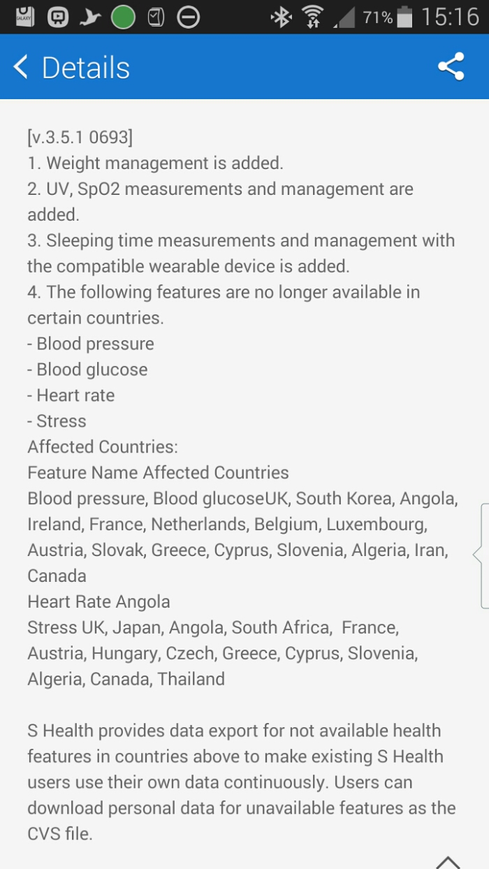 Samsung S-Health App – updated details November 18, 2014Tech NewsSamsung S-Health app updated - features removedGavin Fabiani-Laymond Samsung updated it’s S Health app and removed a lot of features in certain countries. The UK lost blood pressure and stress. There was no warning as the app auto updated. This might make some people unhappy. Share this: Click to share on X (Opens in new window) X Click to share on Facebook (Opens in new window) Facebook Click to email a link to a friend (Opens in new window) Email Click to share on Telegram (Opens in new window) Telegram Click to share on WhatsApp (Opens in new window) WhatsApp Click to share on Pinterest (Opens in new window) Pinterest Click to share on LinkedIn (Opens in new window) LinkedIn Click to share on Reddit (Opens in new window) Reddit Like Loading... Related