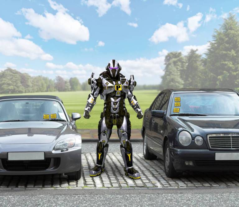 *** FREE TO USE *** UNKNOWN – UNDATED: An image depicts a robot standing between two cars. A scientist has predicted that estate agents and traffic wardens could be replaced by robots in the next 50-years. Leading British scientist Dr Maggie Aderin-Pocock predicts that care for the elderly and even children are among the jobs soon to be replaced by artificially intelligent beings. Research revealed human workers across a plethora of service sectors and caring professions could be replaced by robots within our lifetimes. Dr Aderin-Pocock worked with an artist to reveal her vision of how robots might be used by humans in the future. These images of the future of AI were commissioned to celebrate the launch of new TV series Extant, which starts on Tuesday 20 January at 9pm on Syfy. PHOTOGRAPH BY Barcroft Media UK Office, London. T +44 845 370 2233 W http://www.barcroftmedia.com USA Office, New York City. T +1 212 796 2458 W http://www.barcroftusa.com Indian Office, Delhi. T +91 11 4053 2429 W http://www.barcroftindia.com