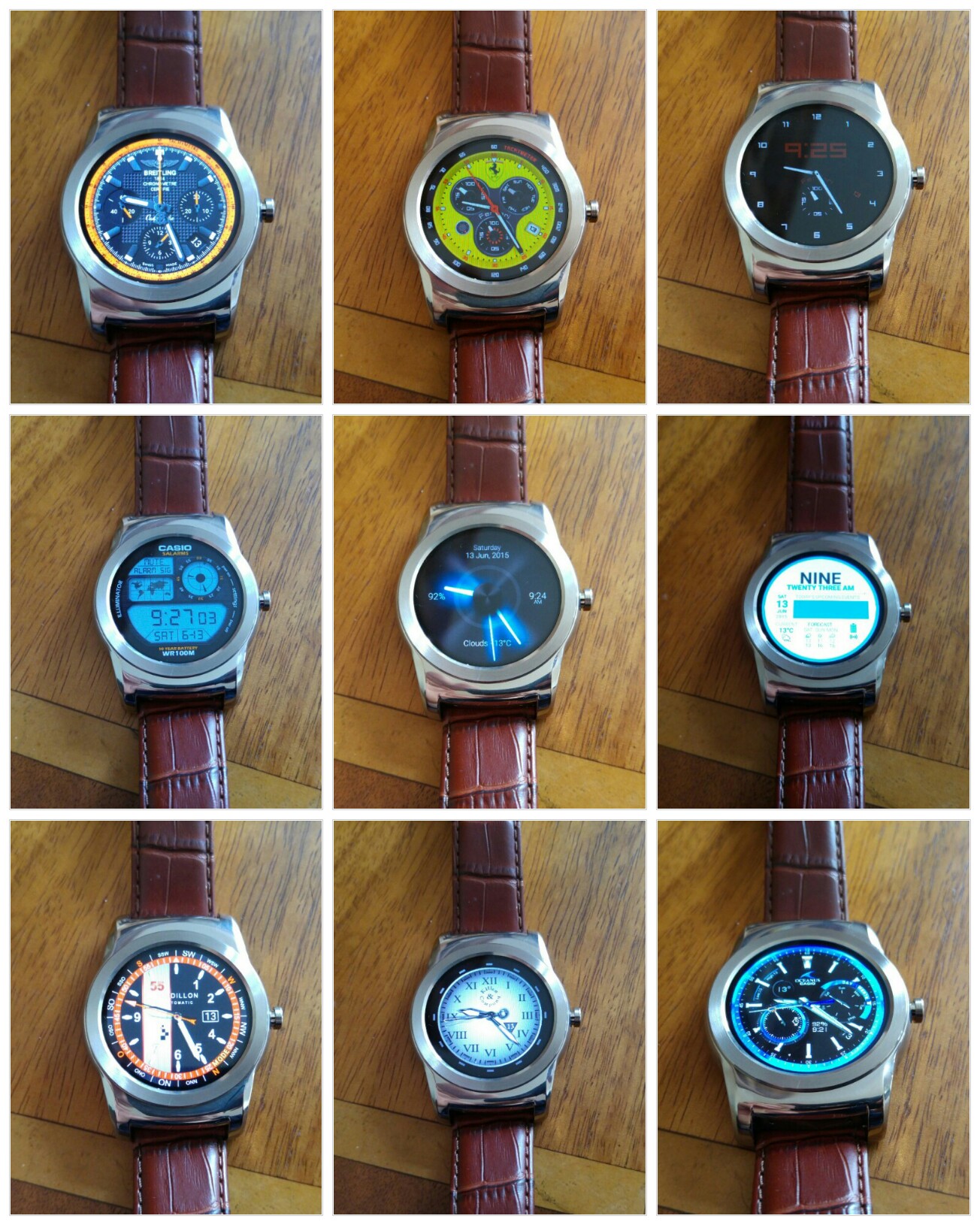 Looking at the first collage shot, and going from left to right, these are the names of each watch faces – Breitling Chronomat 44 Raven, Ferrari Watch, Dimmed Mode sample (after a few seconds all these watch faces offer an always on watch face, but one that uses slightly less battery, sometimes the dimmed mode option is better than the actual watch face) , next row left to right – Casio Illuminator, Hansglo 2, Material, Raidillon igu, Reapur, Casio Blue. With all these watch faces there are normally extra functions too accessed by tapping the watch faces in certain spots.