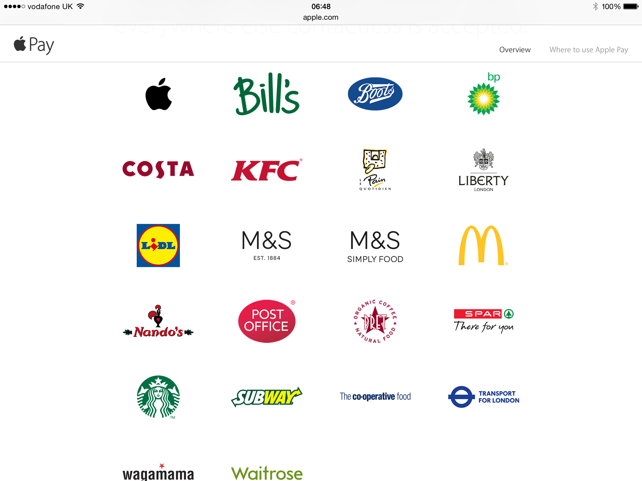 Apple Pay has gone live in the UK. Above is a list of all the places Apple has designated that accepts Apple Pay.