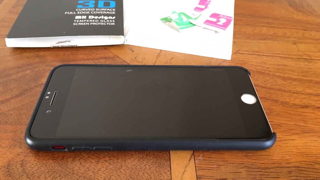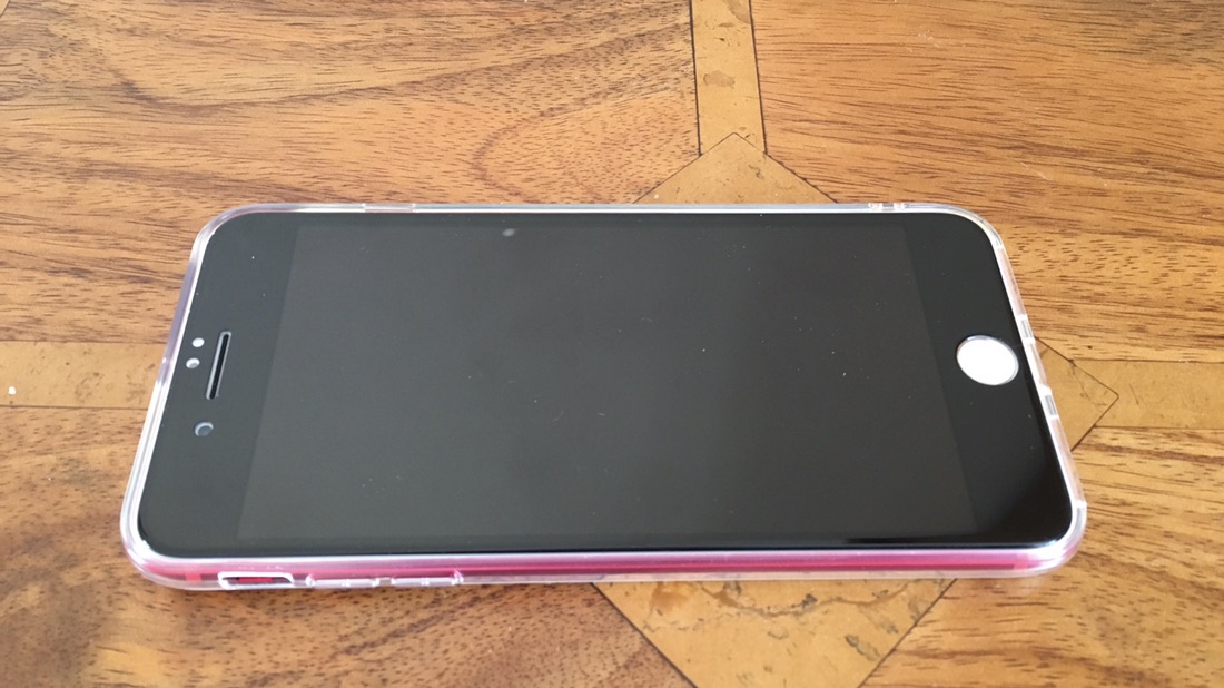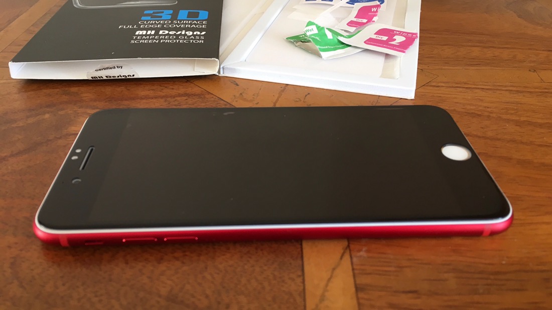 Here’s a top down view with the black screen glass protector fitted. As you can see, there is a slightly amount of white around the edges and the Touch ID button is still white.
