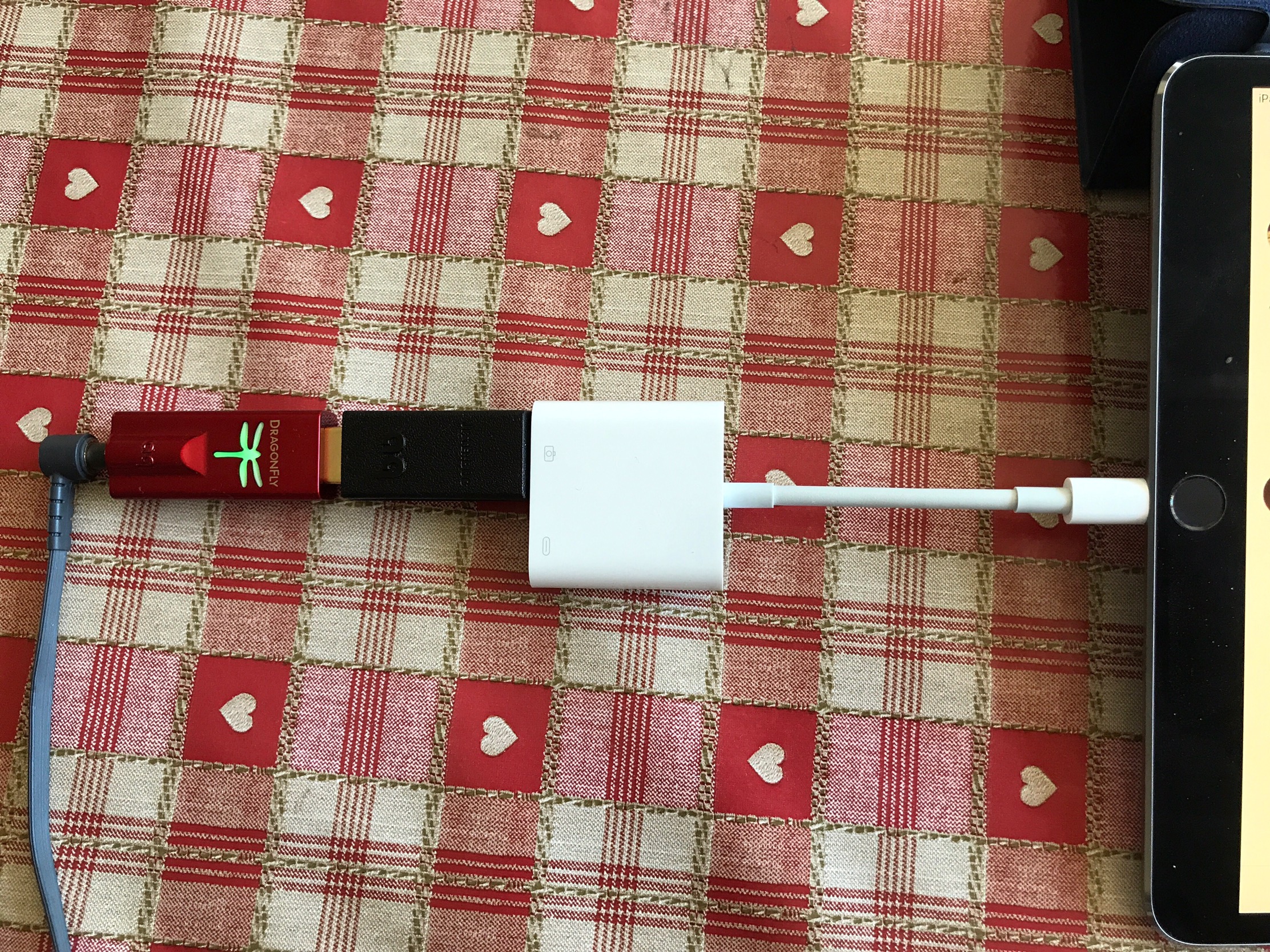 Unfortunately, the old USB2 camera adapter isn’t working and you will need to buy the new USB3 adapter which also costs more than the older version! The setup shown in the photo is a Audioquest Dragonfly Red DAC, Audioquest Jitterbug and the Apple USB3 to lightning adapter. I have used this with my iPhone 7 Plus and iPad Pro 10.5, both of which are running iOS 10.3.2.