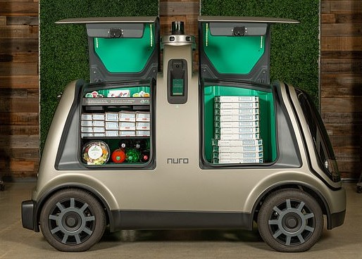 The robot vehicles, made by the well-funded autonomous driving startup, Nuro, are entirely self-driving and can cart their cargo — in this case Domino’s pizza — via in-unit storage.