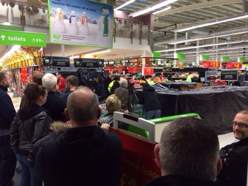 Yesterday was Black Friday in America. It is the day where shops supposedly slash prices and repeat this on Cyber Monday. Asda owned by Walmart did it’s first Black Friday sale yesterday in its stores. Below is queue at an Asda store, with all the Black Friday sale items under wraps.