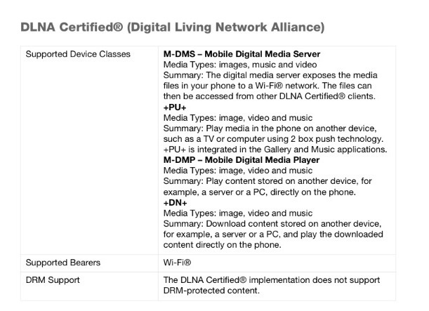Sony Experia Z – list of Bluetooth, WiFi & DNLA profiles