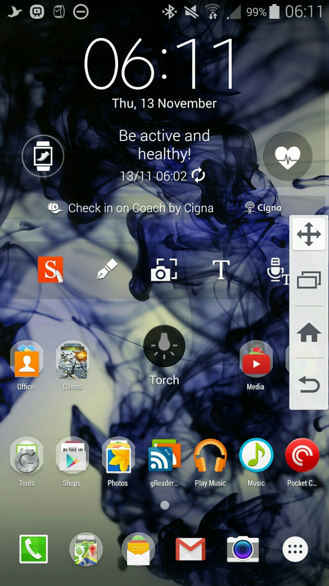 And now to the nightmare scenery with the Note 4. To recap it has sensors galore – heart rate, oxygen levels, UV. A very good camera. S-Pen. Multitasking. QHD screen. And so much more. In fact it’s removed the toolbox gimmick found on the S5 and replaced it with Side Key Panel. See screen shot. Basically you get the bottom capacitive and home key on the left or right edge. It hides when not in use. Flick to bring out. You can move it to your preferred position.