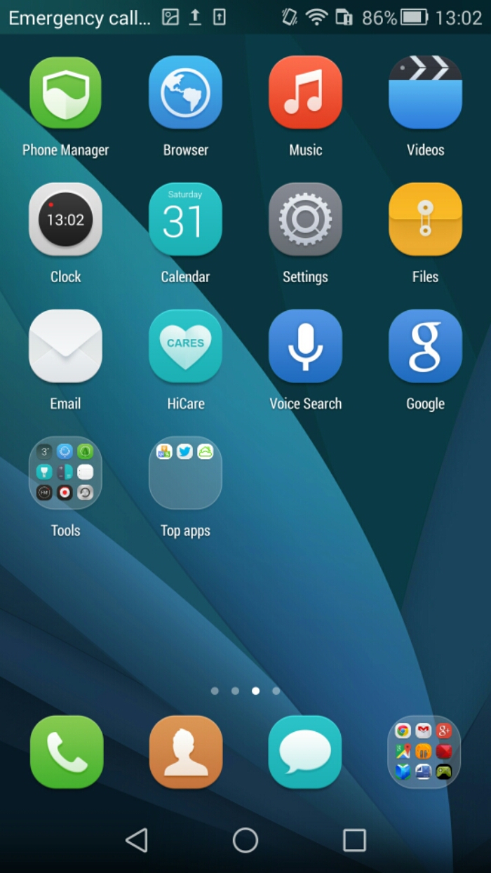 Once passed the lock screen you are taken straight to the main screen. The Honor 6 has skinned icons and a bespoke theme all the way through the phone. This is called Emotion UI. The other aspect of this skin is it removes the app tray. So you will have to use folders on a home screen. Personally I do not see any issue with this. There is a new version of Emotion UI v3 available soon, which offers a flatter and cleaner experience.