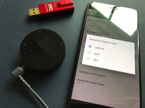 To enable the hi res APT-X HD, go to the settings app, advanced, and right at the bottom is an option for Bluetooth Audio Codec. Tap on this and choose between APT-X, APT-X HD and SBC. SBC is the default. The photo above shows the Astell & Kern XB10 Bluetooth Adapter that outputs the APT-X HD. You can read my review of the Astell & Kern XB10 by clicking HERE.