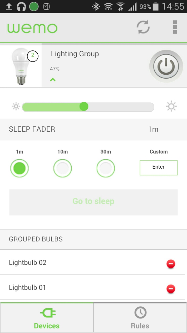 Once the setup is complete the light bulbs show separately. In the edit device menu I just slid one over the other to join them as a group. They are now controlled together. The basic menu gives you an on / off button. Options include brightness and sleep timers. With the advanced settings you can creates rules as to when the lights come on and off eg sunset and sunrise.